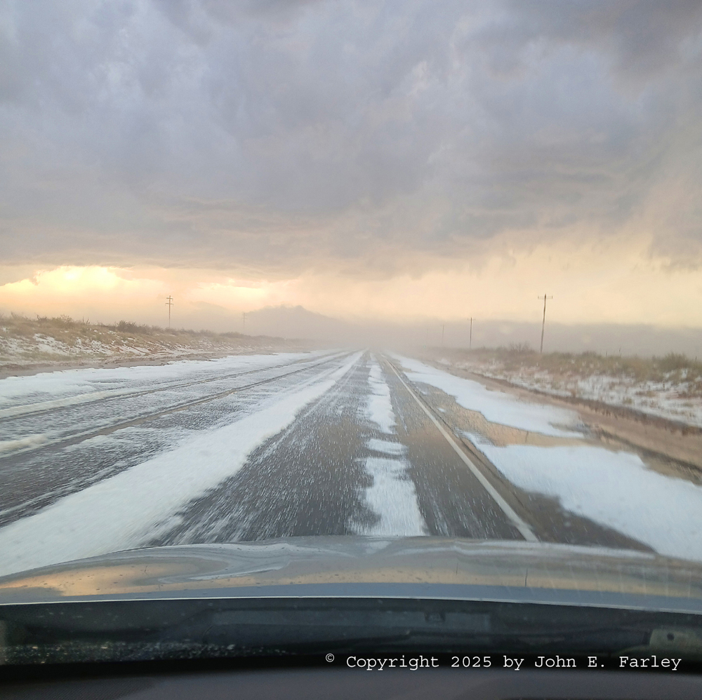 This picture was taken through quite a bit of rain and I think even through the windshield, as the rain and wind was too intense to get out of the car. But after a while it subsided, and I turned back toward 84. The rain picked up again right as I got near 84, and I stopped to get a few more pictures, even this time getting out of the car briefly into the wind-driven rain. Figuring I was near the back edge of the rain again, I decided to head south to see if I could get a better view of the business end of the storm. But almost immediately, I could see almost nothing, as I drove into what turned out to be dense hail fog almost as soon as I was back on 84. Within a half mile to a mile on 84 south of the turnoff, the road was nearly covered with hail, the hail was a few inches deep on both sides of the road. I tried to take a few pictures, but they were not very good because of the dense fog. I went a few miles farther, hoping to get a better view of the storm, but it was not to be. So I turned around, and heading back north, the views were better as the wind had largely blown the hail fog away. Here is a picture of the hail accumulation on the road and along the sides of it, taken through the windshield driving north: