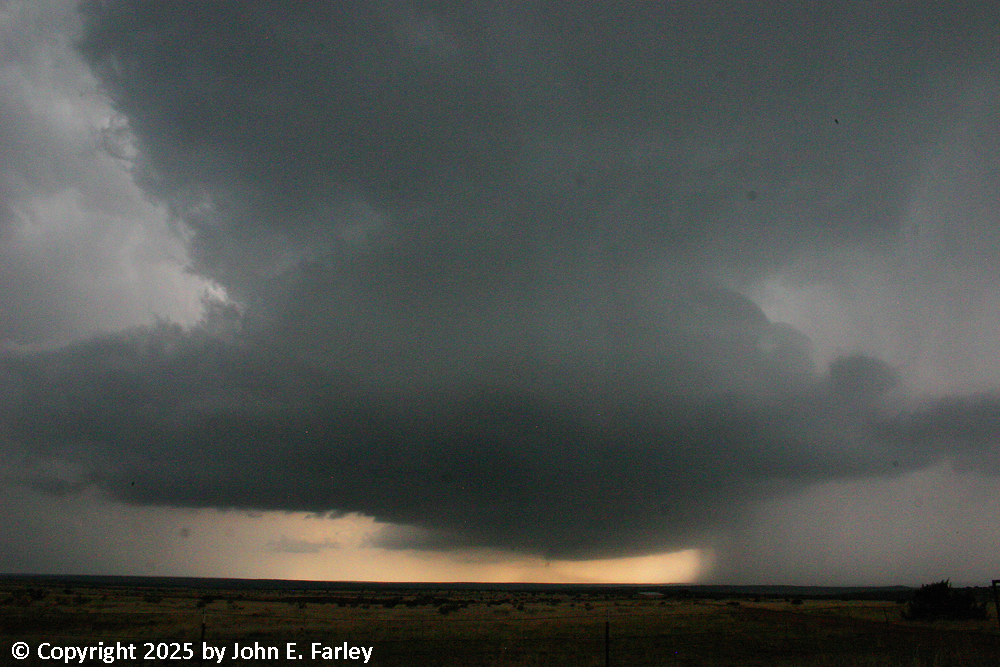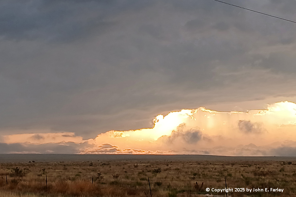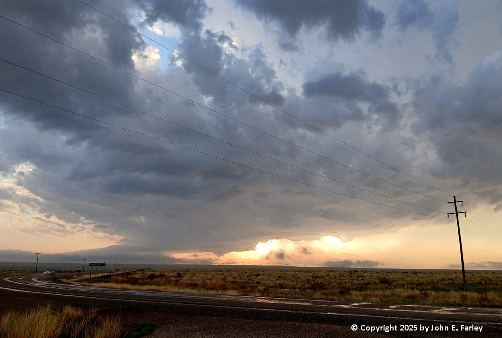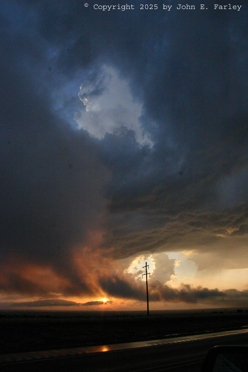 I think this is my new favorite chaser sunset picture, because it has everything in it - the updraft base, an inflow band, the updraft tower visible through a brief opening in the low clouds, the setting sun, and even its reflection on the wet road. And also some barely-visible precipitation under the updraft base. And after this, the chaser kind of changed into the chased. Again, I knew there could be hail, but wanting to get back to Santa Fe before it was dark, I decided to drive under the still SVR-warned storm. I was hoping that I was close enough to being directly under the updraft that any hail would be carried over me by the strong upper winds and fall farther east. No such luck. BANG! I heard the loud sound of a good-sized hailstone striking the car. Then several more, and a couple that broke apart hitting the windshield, too. I was afraid I would lose the windshield, which fortunately I did not, and pretty sure I would have some hail dents in the roof or hood, which upon inspection when I got back to Santa Rosa I did not seem to have, either. But this was large hail, I am sure enough to meet severe criteria, but I never was able to see stones on the ground to see how big they were, and I certainly was not going to get out to look and risk getting bonked on the head. The sound of several of them hitting the car was as loud as I have ever experienced in 30 years of storm-chasing (granted I am usually pretty cautious about hail), so I am sure they were at least an inch in diameter and golfball (1.75") would not surprise me at all. Fortunately, as is often the case with LP supercells, there were not many of them, and in a distance of 2 or 3 miles I was out of the hail. So this kind of capped what I had already decided - this was one hail of a storm-chasing day!