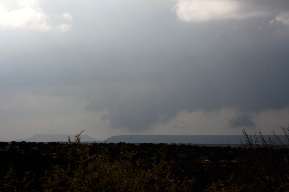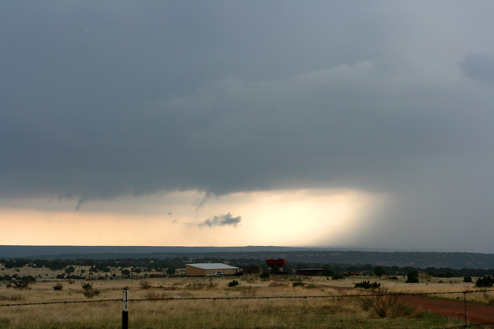 After getting these pictures, I called the 2-inch hail in to NWS ABQ. They seemed very grateful to get the report, and later I saw that was the only LSR they posted on that storm. Likely the hail was even bigger than what I observed earlier and farther west, but the storm was in a thinly populated area so perhaps nobody reported it. Around this time, likely after 5:30, I noticed that a tornado warning had been issued on another storm well to my south, near Fort Sumner. The storm did produce a tornado southeast of there, and since I was returning south anyway, I did briefly consider trying to go after that storm. However, it was soon evident that it was not in a place where I was going to be able to get on it, and in all likelihood would no longer be tornadic even if I could have. However, a new storm was strengthening west and a little north of the tornadic storm, west of Lake Sumner, and I thought I might be able to get to that, so I headed back to Santa Rosa and south again on 84. I was on the wrong side of the storm, but could occasionally see its updraft and backsheared anvil through breaks in the low clouds, so I thought I might be able to see something at least by heading that way.