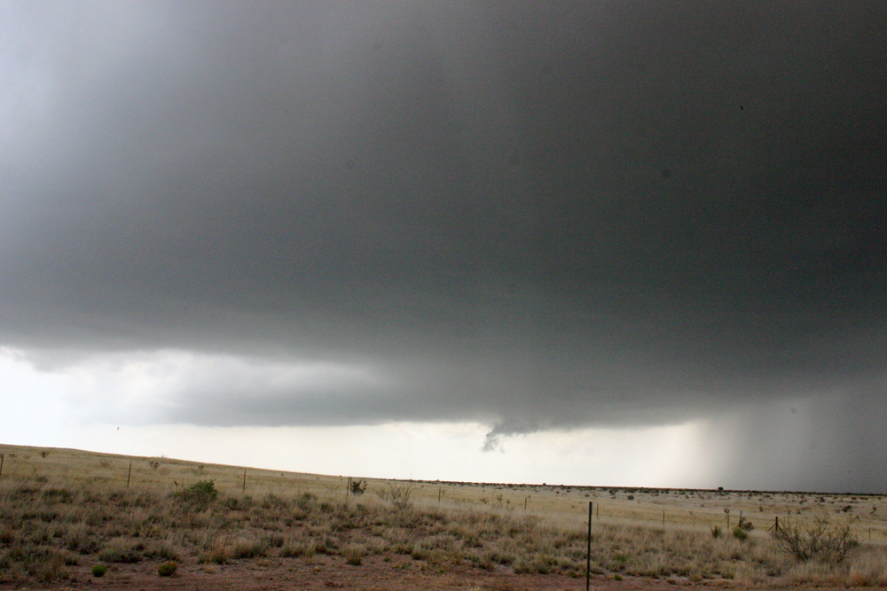 This day was kind of a "sneak attack" setup - not much sign of a chase day until fairly late in the evening before, and more so the morning of. A boundary - something of a hybrid of an outflow boundary, backdoor cold front, and dryline would end up setting up in a north-south allignment in New Mexico not too far east of the mountains, with upsloping, moist air east of the boundary and dry air to the west. Surface winds would be southeasterly, with westerly or southwesterly winds up high, so there would also be wind shear. But the setup was not evident 24 hours earlier, as most forecasts and models kept the backdoor cold front to the northeast and dryline farther east. However, the previous day, intense dryline thunderstorms occurred over the Texas Panhandle, especially the southern part of it, and this sent moist outflow to the west and effectively shifted the backdoor cold front farther west and south of where it was expected to be. One result of this was that in the late evening, scattered thunderstorms became widespread over east-central and southeast New Mexico. These were mostly non-severe, but heavy, training storms produced a serious flash flood situation around Fort Sumner, NM. Some places just southeast of there got up to 7 inches of rain, with 4-7 inches in a number of locations in and just east and south of there. US 84 closed for a time because of flooding. This further moistened the air in eastern NM, and forced the outflow boundary/backdoor cold front westward to west of Fort Sumner and Santa Rosa, with moist southeasterly upslope flow over most of the eastern plains. By the early morning SPC outlook, most of NM east of the mountains was in a marginal risk, and the discussion mentioned a possibility of tornadoes. By mid-morning, NWS ABQ issued a flash flood watch for parts of eastern NM, anticipating strong storms with heavy rain. And soon after, SPC upgraded east central and southeast New Mexico to a slight risk, again mentioning the risk of tornadoes.