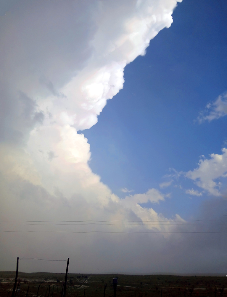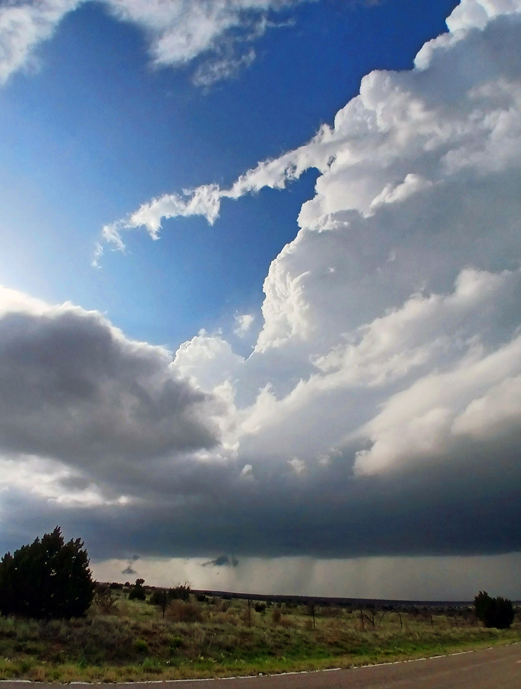 It took a while, but by around 7 p.m. on the road west to Lake Sumner State Park a mile or two west of 84, I began to get a decent view of the updraft and anvil of the storm I was targeting. As I got closer to the turnoff to Lake Sumner, I encountered increasingly heavy rain. This was wrapping around the storm on the north side of the main updraft, driven by strong easterly to southeasterly winds on the north side of the rotating storm. I had to get a mile or 2 west of 84 to get a decent view of the storm structure looking to my southeast, and even then I was still in pretty heavy rain and maybe a little hail, even though by then the edge of the anvil was directly overhead and the main updraft of the eastward-moving storm well to my southeast. Here is a picture I took of this storm around this time: