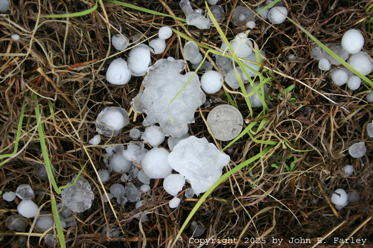 Near the ground looking ahead in this picture, you can see some of the lingering hail fog, which was being blown to the northwest by the southeasterly wind. It did appear to me that although there was a lot of hail, it was all small, well below severe criteria. Also you can see the base of an LP supercell that was northwest of the storm that produced this hail, and sunlit sky visible through the limited precipitation of that storm. That was the next and final one that I chased, although it kind of also chased me.