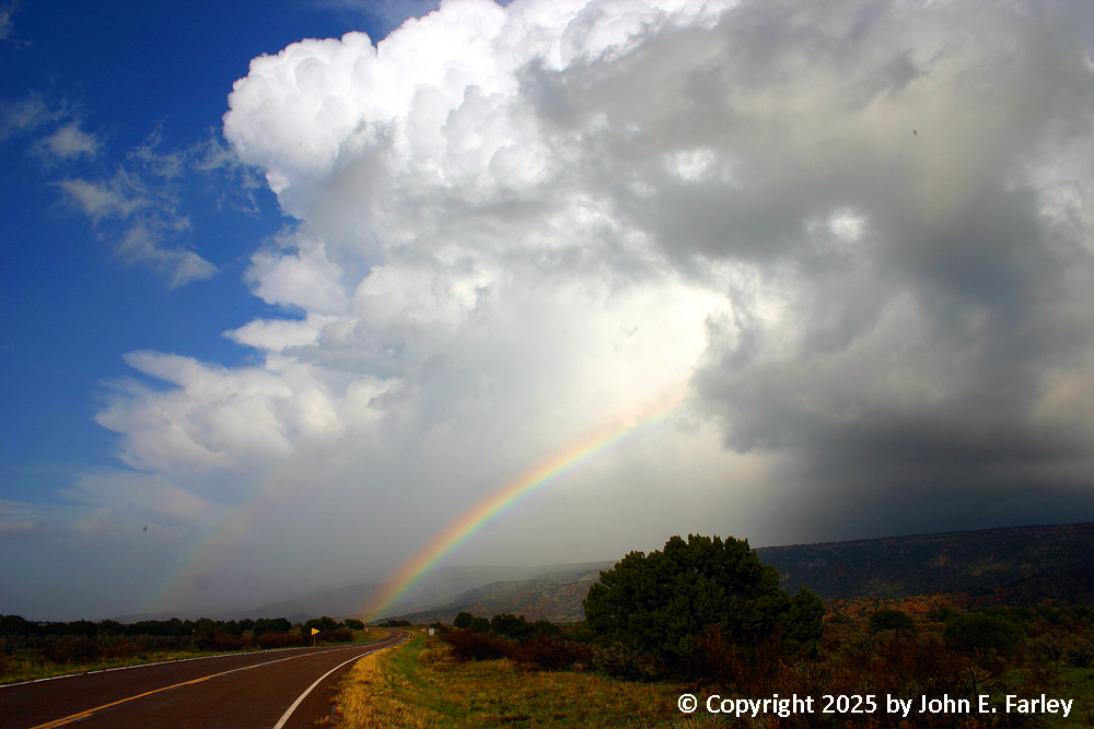 The storm was now getting ahead of me and moving into very difficult chase terrain, so I decided not to pursue it any further. It weakened soon after that, anyway. However, before it got away it offered me this view of its backside, along with a double rainbow: