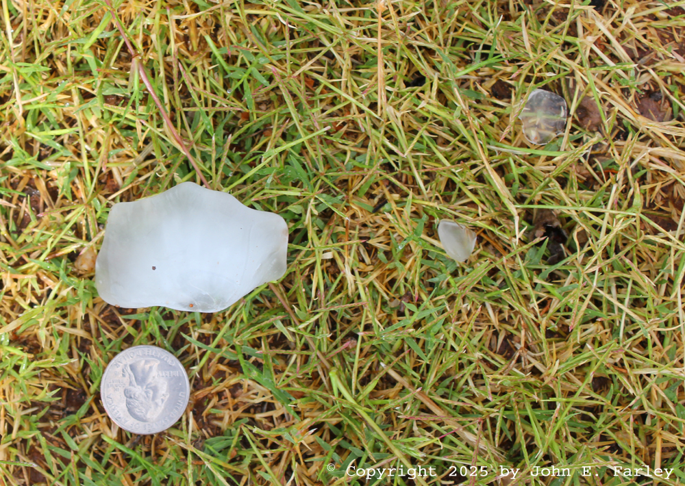 Once I knew that the northern storm was dying and the southern one was now the dominant storm and likely to stay that way, my mission was to try to catch up with it without getting caught in giant hail. Normally when you are behind a storm that is not easy, but in this case the movement of the storm was only around 10 to 15 mph to the east-southeast, and I had a pretty good road network including some roads that ran NW-SE, so I thought it might be possible, and it turned out it was. I heard about a large tornado north of Morton, which turned out to be probably the most spectacular tornado of the day, and unfortunately I missed that one. I was not terribly far from it, but being on the back side of the storm there was way too much rain to have any good chance to see it. But I kept trying to catch up, and eventually it worked. In the meantime, as I crossed the storm's path behind it heading southward, I encountered a lot of leaves stripped off trees, and then some big hailstones in Maple, TX. I stopped briefly and photographed a couple 2.5-inch hailstones: