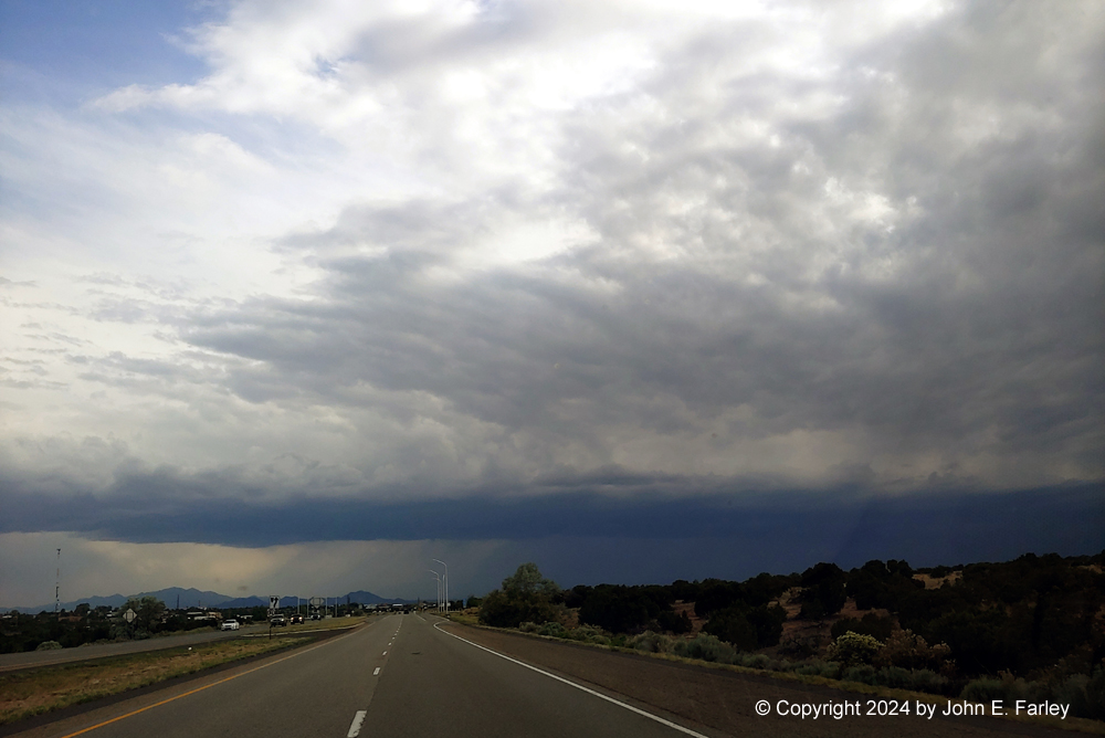 After the storm passed my location, it got two more SVR warnings, and driving back up route 599, the rainfall became so intense that I decided to exit the highway and wait a few minutes until the core was well past me. There was some CG lightning that was pretty close, but I did not manage to capture any bolts. The last of the 4 SVR warnings the storm got extended all the way up to the Taos area, but once the storm got into the mountains, it weakened quickly, and that warning was cancelled.