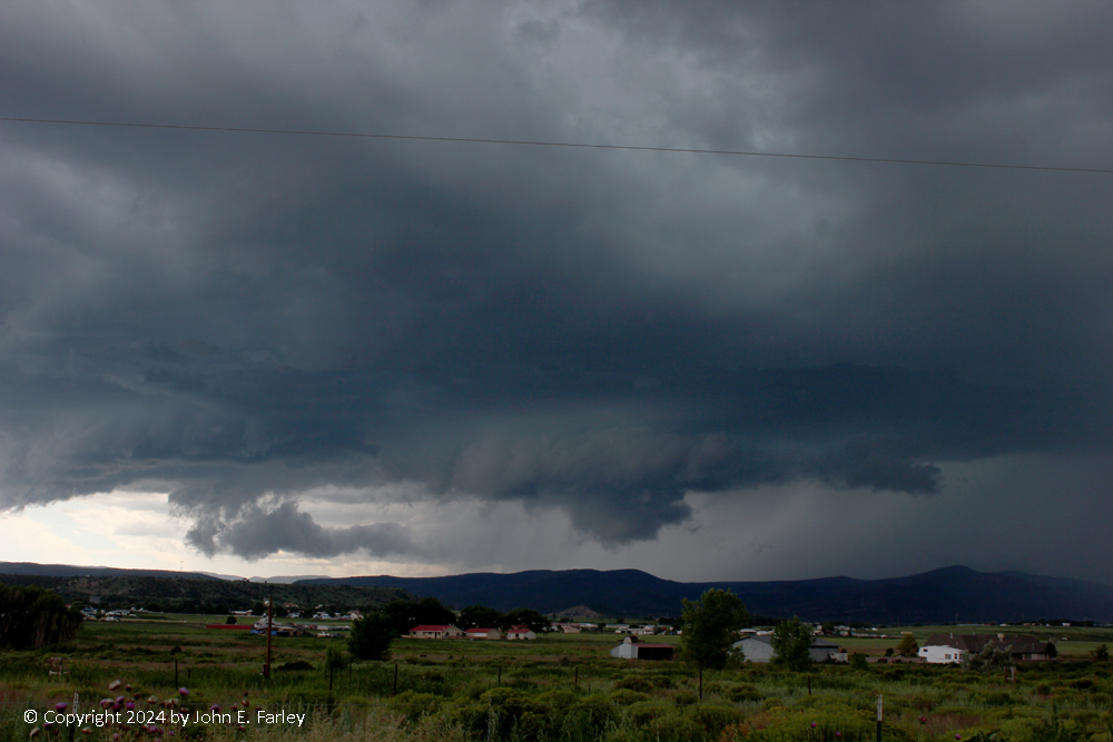 The storm had nice structure, though at this time not really a wall cloud, but it seemed to be marginally supercellular as it was a single cell, intense, and a right mover, being driven to the SW or SSW by its updraft on the SW edge of the storm in the presence of weak steering flow to the SE or SSE. I took quite a few pictures, including these two: