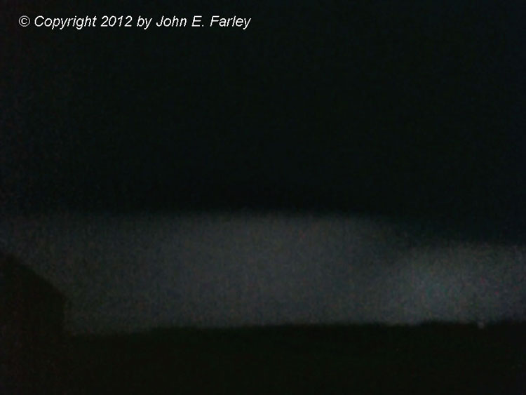 As it turned out, I might have done better photo-wise had I done that, because nearly all the lightning in this storm was in-cloud, not cloud-to-ground. I saw one or two CG bolts while driving to the Hamel exit, while up in the clouds, the lightning danced continuously. Once I made it to Hamel and set up for lightning photos, I saw exactly two CG bolts, and didn't get pics of either of them. One was a huge, presumably positive bolt that hit 2 or 3 miles away, followed by the tremendous thunder typical of such bolts. But that hit just before I was ready, so I missed it. Still, despite the lack of bolts in my viewfinder, I did manage to get a couple interesting shots thanks to the varying illumination by the lightning and street lighting of a barn and outbuilding near where I set up: