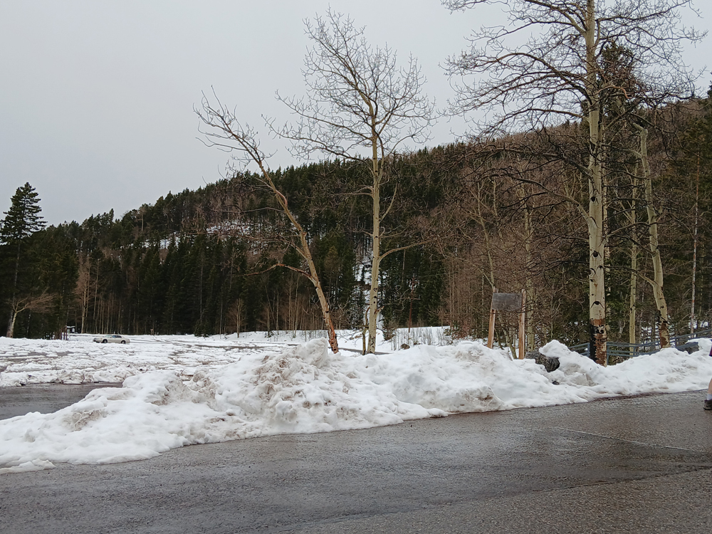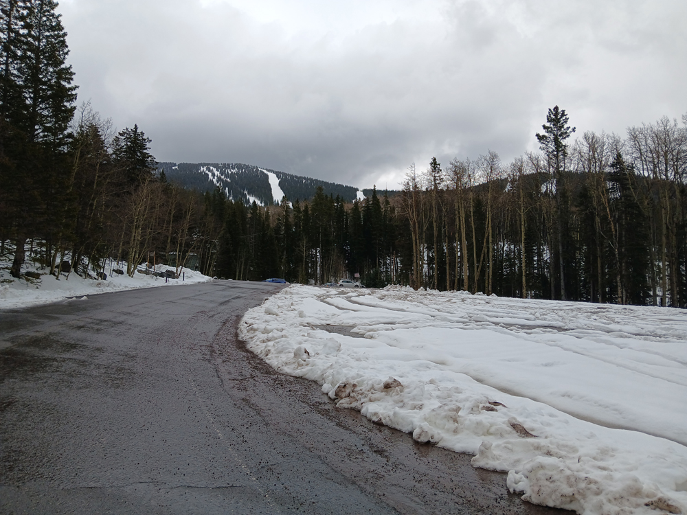 This picture shows the precipitation coming out of the clouds looking west or WNW. Before long, I heard a rumble of thunder, then another, even though there was little or no precipitation where I was. The thunder seemed to be coming from the north or northwest. With the showers/storms moving to the SSW, I was afraid the precipitation might pass to my west, but I began to see that some precipitation was beginning to slightly obscure the mountains north of the ski area. So I moved up to the main parking lot of the ski area. There was plenty of snow on the ground at the scenic overlook, and more at the ski area. As noted earlier, around 8-10 inches of heavy wet snow remained from the 14+ inches that had fallen over the previous six days. Enough that there were plenty of places where you could get stuck at both the scenic overlook and the ski area parking lot, since only the main road had been plowed. But by driving where others had driven, I was able to avoid that.