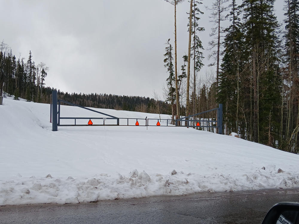 These pictures, which I took after the storm had passed, all show views from the ski area's parking lots. The first one also shows the ski runs, where people have been hiking up to ski the past several days. (The ski area has been closed for more than a month, so no lifts: you have to "earn your turns.") The third one shows the entrance to an upper parking lot - would have been tough to get in there, even if the gate had not been closed.