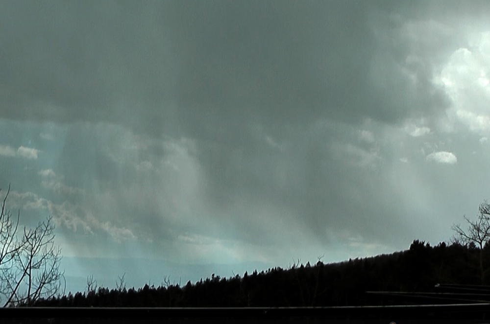 I got to the scenic overlook a half mile or so before you get the ski area around 3:30 to 3:45. There was little in the way of precipitation (maybe a few sprinkles) there, but I could see precipitation coming out of the clouds in a small area directly to my west, and darker, more precipitation-laden skies to my north.